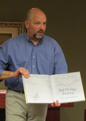 Michael Hale showing “Bad Monkey Business,” which he wrote and illustrated. Photo by Carol Osman Brown.