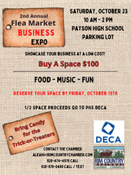 Here’s the description: In October we will be holding our 2nd Annual Flea Market Business Expo. Held at the Payson High School parking lot on Saturday, October 23rd from 10am to 2pm, this event is a great low-cost marketing and networking opportunity. There will be music provided by KRIM, food trucks and we encourage businesses to bring candy for any trick-or-treaters who stop by. Spaces are $100 for Chamber members and half of the proceeds will go to the DECA program at the high school. Please reserve your space by October 15th. And be sure to ask about our sponsorship opportunities for more bang for your marketing bucks!